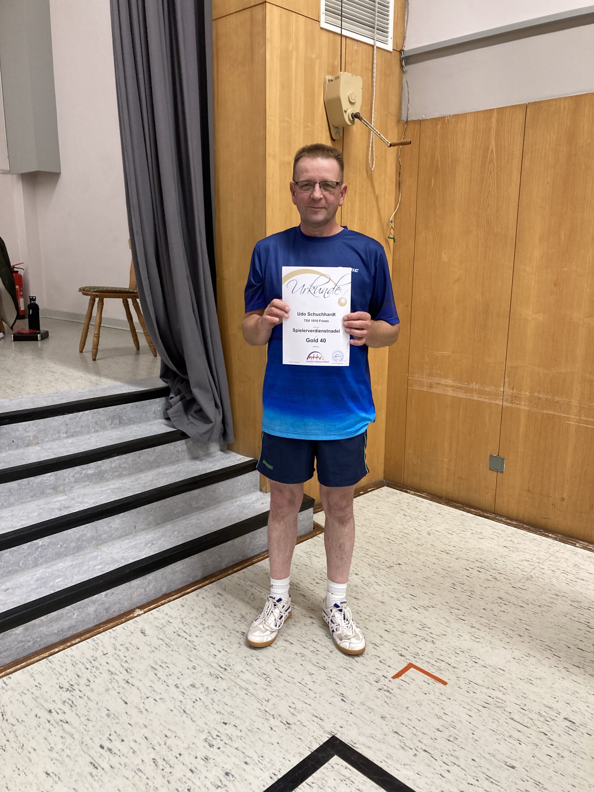 Im Rahmen des Serienspiels der 1. Mannschaft des TSV Frieda wurde unser Spieler Udo Schuchhardt mit der Spielerverdienstnadel Gold40 für 40 Jahre aktives Tischtennisspielen ausgezeichnet.
