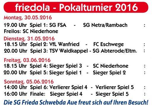 Im Starterfeld um den „friedola-Pokal“ steht neben dem A-Ligisten SG FSA auch die Spielgemeinschaft aus Netra/Rambach, die sich als Aufsteiger in der A-Liga etablieren konnte. Zwei weitere A-Ligisten nehmen am traditionellen Pokalturnier teil: Zum einen die Spielgemeinschaft Abterode/Eltmannshausen und zum anderen der frisch gebackene A-Liga-Meister des TSV Waldkappel, welcher in der nächsten Saison in der Kreisoberliga um Punkte kämpfen wird.