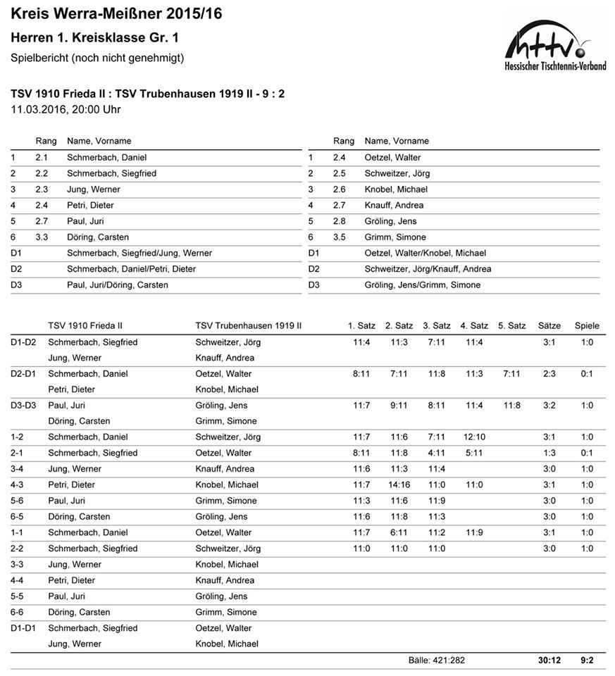 An der Haltestelle Weinberghalle Frieda traf gestern die Lokomotive aus Trubenhausen mit Verspätung ein. Das hinderte die Insassen allerdings nicht hochmotiviert zu Werke zu gehen. Von der Tabellenkonstellation unbeeindruckt ging es in den Eingangsdoppeln umkämpft und eng zur Sache. Die Trubenhäuser Ötzel/Knobel konnten den Fried’schen D. Schmerbach/Petri den Zahn aus dem Antriebszahnrad ziehen und entschieden die Partie in 5 Sätzen für sich, nachdem S.Schmerbach/W. Jung erwartungsgemäß gegen Schweitzer/Knauff gewonnen hatten. Dann kam es zum zweiten umkämpften Doppel. Juri Paul hatte das Vergnügen an der Seite von Carsten „Helldrive“ Döring aufschlagen zu dürfen, der sich im Doppel allerdings auf dem D-Zug als Jim „Lui“ Knopf versuchte. Von seinem zügigen Spiel war in den ersten Sätzen wenig zu spüren. Einzig die Heizung blies zügig. Im 5. Satz besann er sich dann aber seiner Tempoleidenschaft und gewann schließlich mit Paul etwas glücklich in 5 Sätzen gegen Grimm/Gröling. Im ersten Einzel hat S. Schmerbach kein Rezept gegen das Spiel von Ötzel. Dr. Schott hatte vergessen es auszustellen. Ötzel zog die Bälle immer wieder geschickt langsam und kurz an, wogegen Schmerbach Senior überhaupt kein Mittel fand. Er unterlag für seine Verhältnisse deutlich in 4 Sätzen. Sohnemann Daniel hatte ebenso Probleme mit Schweitzer. Ab Satz 3 fand Schmerbach keine richtige Einstellung mehr im Spiel und rettete sich noch knapp in 4. Sätzen ins Ziel. Danach hatte Dieter Petri anfangs auch so seine Schwierigkeiten gegen Knobel. Er profitierte nach verlorenem 2 Satz von der Verletzung von Knobel, der nach einem unglücklichen Sturz aufgeben musste. An dieser Stelle gute Besserung an den Pechvogel. Danach nahm der D-Zug fahrt auf und war nicht mehr zu bremsen. Glatte Siege von Jung, Helldrive-Döring und Paul folgten. Bei D. Schmerbach geriet der Motor nochmals kurz ins stottern. Er musste kämpfen um in 4 Sätzen gegen den an diesem Abend starken Ötzel zu gewinnen. Schweitzer musste sich dann ebenfalls kampflos S. Schmerbach beugen. Ein Dankeschön geht an die fairen und motivierten Gäste aus Trubenhausen mit besten Genesungswünschen. Nach Spielende verweilte man noch im Speisewaggon eher der Zug in Richtung Aue weiterfuhr, wo am Montag das nächste Spiel ansteht. Bei diesem Spitzenspiel wird Frieda wieder auf Olli Schott zurückgreifen können, der hoffentlich in der Zwischenzeit beim Friseur war.