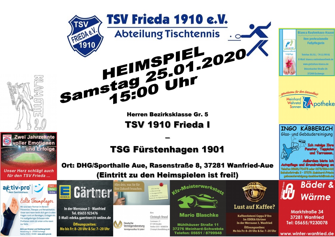 Der Tabellenführer kommt nach Frieda! 8. Januar 2020 | Kategorie: Tischtennis Achtung! Aufgrund der Jahreshauptversammlung der Feuerwehr Frieda weicht das Spiel auf die Sportstätte Aue aus!