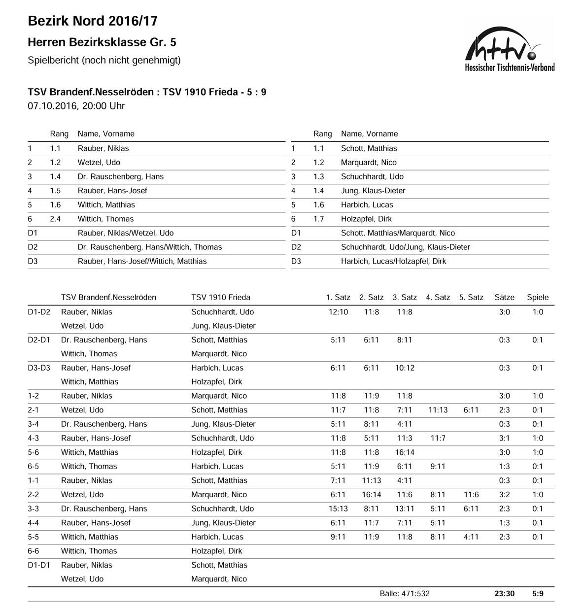 Dann kam mit drei Siegen in Folge die stärkste Phase der »Friedschen«: zwei hartumkämpfte Fünf-Satz-Siege von unseren Neuzugängen Udo und Lucas und einem nur kurz gefährdeten Erfolg von K.-D. bescherten den wichtigen 9:5-Erfolg bei den bisher noch ungeschlagenen Nesselrödern.