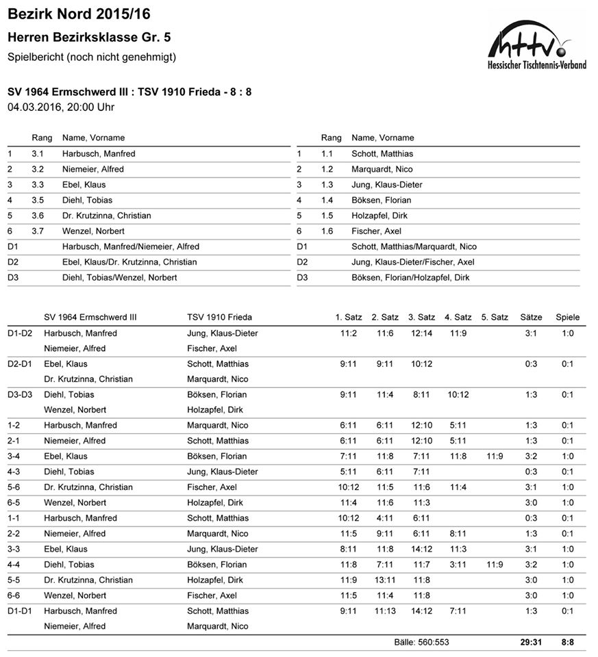 Der TSV Frieda setzt seine Erfolgsserie fort. Bei Ermschwerd III holte man beim 8:8 einen Punkt und baute die Serie auf 5 ungeschlagene Spiele bei 9:1 Punkten aus. Damit festigte Frieda Tabellenrang 5 bei 20.16 Punkten. Der Euro-League Platz sollte den Fried’schen somit kaum mehr zu nehmen sein. Die Geschichte des Spiels ist schnell erzählt. Die beiden Spitzenspieler des TSV Schott und Marquardt erwischten einen Sahnetag und holten zusammen 6 Punkte. Sie gewannen Beide Doppel und alle Einzel gegen Harbusch und Niemeier relativ ungefährdet. Schott baute damit seine Einzelbilanz auf 13:1 Siege und Marquardt auf 10:4 Siege aus. Sie waren die einzigen, die sich vom federnden Hallenboden Auftrieb holten. Im Doppel gewannen außerdem noch Böksen/Holzapel in der Anfangseuphorie. Im Einzel konnte Ihnen nur K.D. Jung im mittleren Paarkreuz beim Sieg gegen Diehl folgen. Ansonsten blieb man in der Mitte und Hinten ohne Erfolg. Böksen hatte an diesem Tag kein Zielwasser getrunken und verlor beide Einzel unglücklich mit 9:11. Trotzdem steigt bei ihm das Formbarometer langsam wieder an. Hinten hatten Holzapfel und Fischer keine Chance. An diesem Tag lief der Arzt aus Ermschwerd Dr. Krutzinna unserem Arzt aus dem TT-Camp Dr. Bob Schott den Rang ab. Er gewann gegen beide. Da half es Fischer auch nicht, das die Apotheke im Spiellokal in Ermschwerd integriert ist und abends geöffnet hat. So viel Medizin wie zur vollständigen Heilung nötig gewesen wäre, konnte ihm nicht ausgegeben werden. Vielleicht schonte man sich auch nur für das kommende Spitzenspiel gegen Oberhone um den Heimnimbus zu wahren. Fazit: