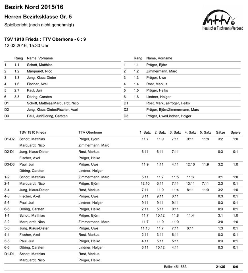 Die erste Mannschaft des TSV Frieda stemmte sich am gestrigen Spieltag lange erfolgreich gegen die Niederlage im Spitzenspiel. Am Ende unterlag man nach großem und beherzten Kampf und sehr starker Leistung denkbar knapp mit 6:9. Kaum auszudenken, was möglich gewesen wäre wenn die Fried’schen mit kompletter Mannschaft hätten antreten können. Diese mussten gestern auf Commander Holzapfel und Goldfinger Böksen verzichten. Hierfür sprangen Paul und Döring aber mehr als nur in die Presche. Schon in den Doppeln deutete sich an, dass es ein harter Kampf für Oberhone werden würde. War der Sieg von Schott/Marquardt noch einigermaßen standesgemäß, so konnte man keinesfalls mit dem Sieg von Paul und Döring rechnen. Überragend ihre Leistung und ihr Kampfgeist. Sie zwangen U. Pröger/Lindner nach Satzrückstand und hartem Kampf noch in 5 Sätzen in die Knie. Nach den Doppeln zeigte Matthias Schott, dass er sich immer mehr seiner Glanzform aus alten Tagen nähert. Er bezwang im Spitzenpaarkreuz erst Zimmermann und später sogar den Ranglistenersten Björn Pröger in souveräner Manier. Wenn er sich weiter so steigert, sollte er ihm bald den Rang ablaufen. Nico Marquardt wollte Schott in Nichts nachstehen. Hatte er im ersten Einzel noch Pech und verlor nach starker Vorstellung gegen B. Pröger noch auf der Ziellinie in 5 Sätzen, so dominierte er danach Zimmermann nach Belieben und siegte klar in 3 Sätzen. In der Mitte erlebt K. D. Jung mit seiner Brille den 3. Frühling. Er gewann nach großem Kampf knapp in 5 Sätzen gegen Rost. Der aufrückende Fischer hingegen hatte gegen U. Pröger und später Rost keinerlei Chance. Die Ersatzmänner Paul und Döring machten im hinteren Paarkreuz ihre Sache sehr gut hatten aber letztendlich gegen Heiko Pröger und Holger Lindner nichts zu bestellen. K. D. Jung kam letztendlich mit dem Spiel von Uwe Pröger auch nicht zu Recht und verlor somit das mitentscheidende 2 Spiel in der Mitte. Eine bärenstarke Präsentation von Frieda, die in dieser Verfassung jeden Gegner in dieser Klasse das Fürchten lehren können!