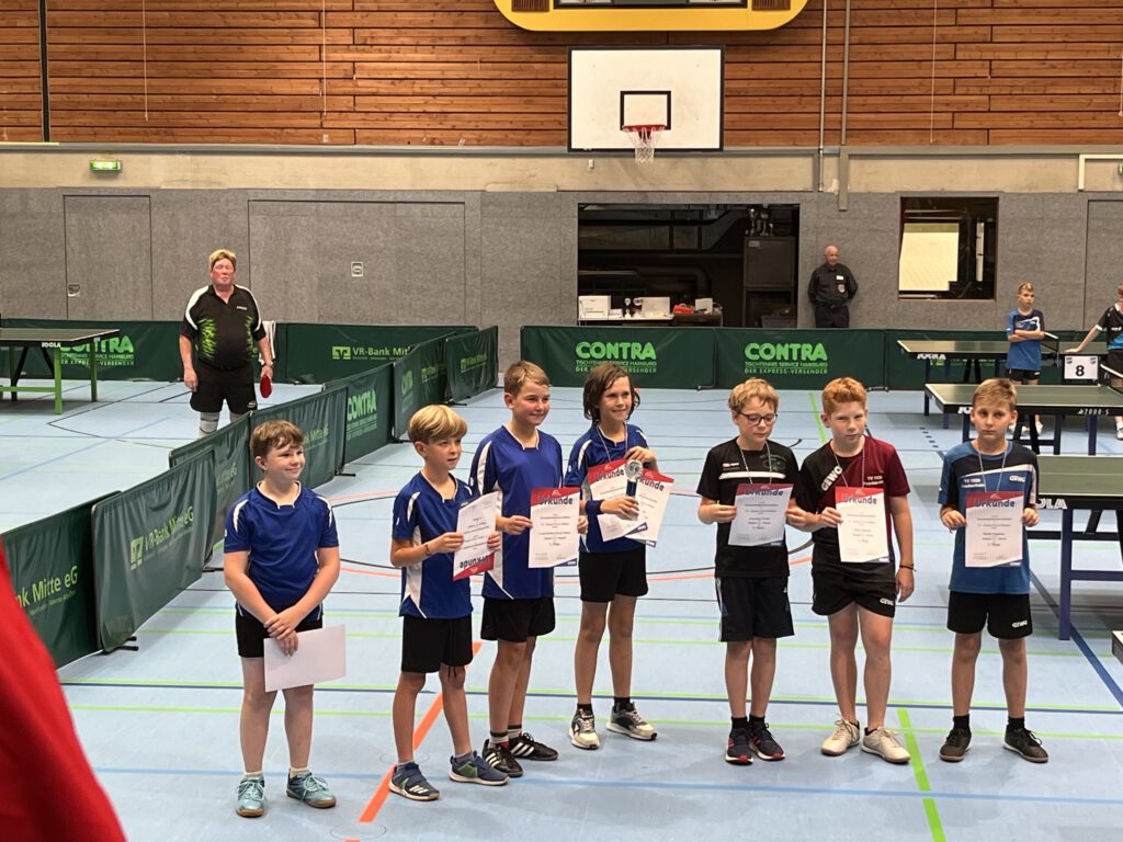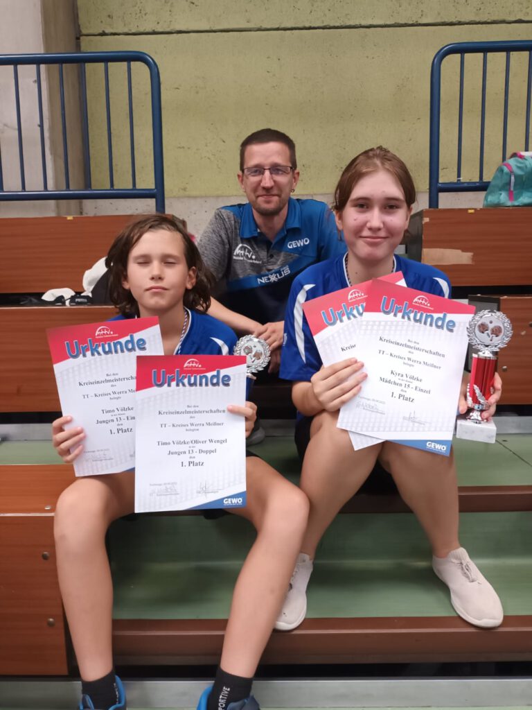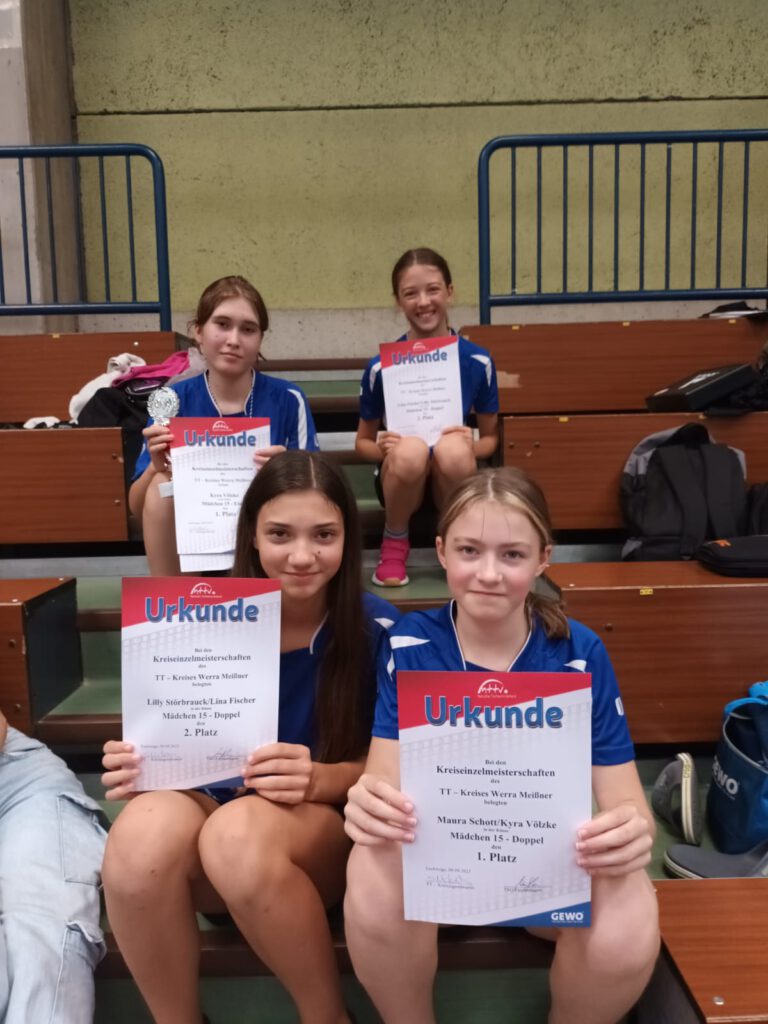 Es war ein grandioser Tag für den Tischtennis-Nachwuchs aus Frieda mit 2 Kreismeistertiteln im Einzel (Timo Völzke, Kyra Völzke), 2 Kreismeistertiteln im Doppel (Timo Völzke / Oliver Wengel sowie Kyra Völzke / Maura Schott), zwei 2. Plätzen im Doppel (Louis Fischer / David Fischer sowie Lina Fischer / Lilly Störbrauck) und einem 3. Platz im Einzel (Lina Fischer).