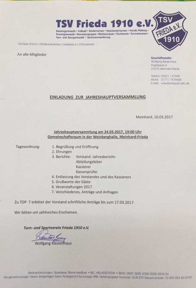 Jahreshauptversammlung 2017 21. März 2017 | Kategorie: Allgemein Alle Mitglieder des TSV Frieda 1910 sind eingeladen!