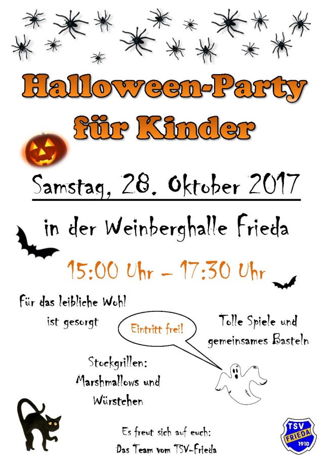 Der TSV Frieda 1910 e. V. lädt in diesem Jahr wieder zu einer Kinder-Halloweenparty in die Weinberghalle nach Frieda ein. Geister und Hexen sind herzlich willkommen! Es erwarten die Kinder und natürlich auch die Eltern, Großeltern, Paten, Freunde und alle anderen, die Lust haben, den Nachmittag mit den Kindern in der Weinberghalle zu verbringen, tolle Spiele, herbstliche Bastelideen und leckeres Essen. Gegen Ende der Veranstaltung können die Kinder ihr eigenes Würstchen oder Marshmallow am Stock grillen.