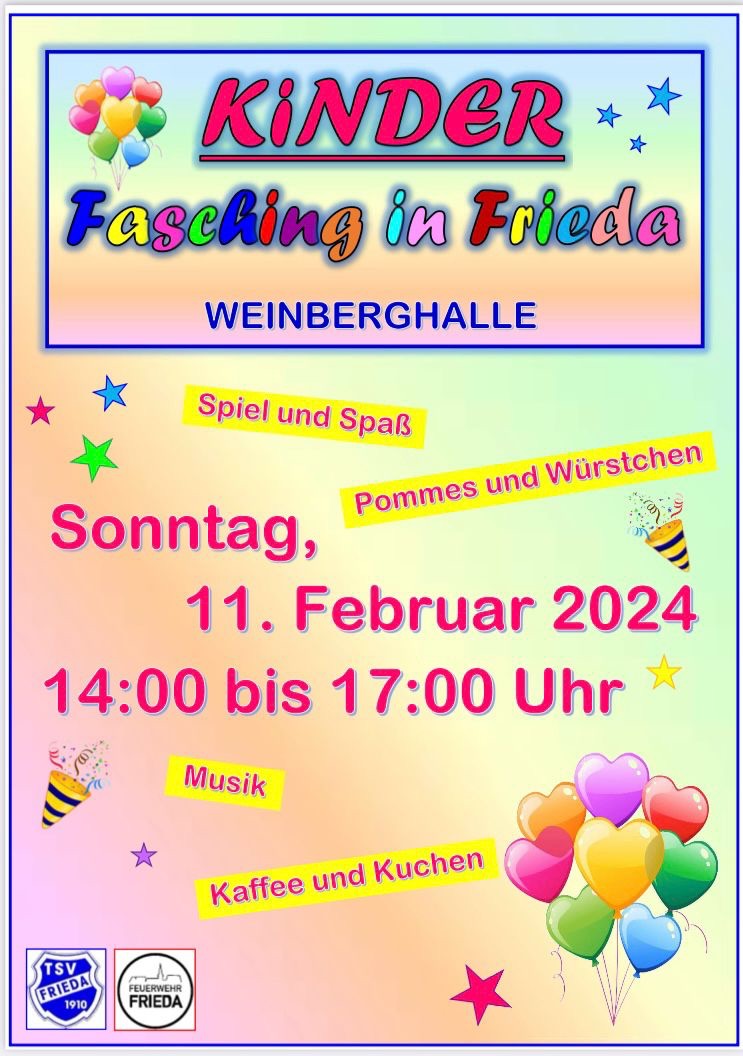 Am Sonntag, den 11.02.2024, laden wir euch zusammen mit der Freiwillige Feuerwehr Frieda um 14.00 Uhr zum Kinderfasching ein. Auf euch warten ganz viele Spiele, Spaß und Musik. Natürlich auch leckeres Essen und Kaffee und Kuchen 🍰 🌭🍟🎉