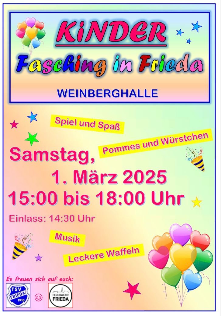 🥳 Am Samstag, den 01.03.2025, laden wir euch zusammen mit der Freiwilligen Feuerwehr Frieda um 14.30 Uhr zum Kinderfasching ein.