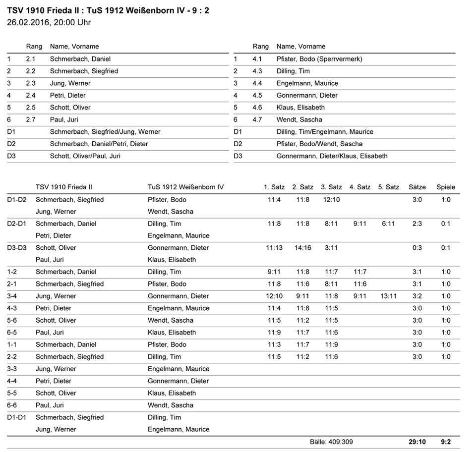 Gestern Abend tagte das zuständige Ortsgericht vor der Ersten Abstellkammer des TSV Frieda. Angeklagt waren 6 Verdächtige des TUS Weissenborn der groben Erfolgsgefährdung im minderschweren Fall. Der zuständige Richter Dieter ‚Justizia‘ Petri versuchte sich mit seinen ausnahmsweise 5 Schöffen einer schnellen Urteilsfindung. Die ersten Angeklagten Pfister/Wendt gaben schnell ihre Schuld zu und beugten sich dem Urteil mit 0:3 Stimmsätzen. Danach gab es Widerspruch von Gonnermann/Klaus und Dilling/Engelmann. Ihre Erfolgsgefährdung sollte aber keinen Einfluss auf das Urteil haben. Danach überzeugten alle Friedaer Schöffen den Richter, wobei sich Werner Jung mit seinem Urteil schwer tat. Der Fall Gonnermann war aber auch schwer zu verhandeln. Der Spass stand beim gestrigen Spiel des TSV Frieda II gegen Weissenborn im Vordergrund, und so ging es in freundlicher Atmosphäre relativ schnell. Besagte Weissenbörner Doppel besiegten Schott/Paul und Petri/Schmerbach. Ansonsten konnten alle Fried’schen in ihren Einzeln ausnahmlos überzeugen. Nur beim Sieg von Werner Jung wurde es knapp. Alle anderen Siege fielen relativ deutlich aus. Zu erwähnen bleibt noch der sehr deutliche Sieg von Olliver Schott, der frisch frisiert mit extremer Windschnittigkeit zu überzeugen wusste. Ein nur am Anfang gefährdeter 9:2 Sieg von Frieda stand am Ende im Gerichtsprotokoll. Punkte für Frieda: S.Schmerbach/Jung, S. Schmerbach 2, D. Schmerbach 2, Jung, Petri, Schott und Paul.