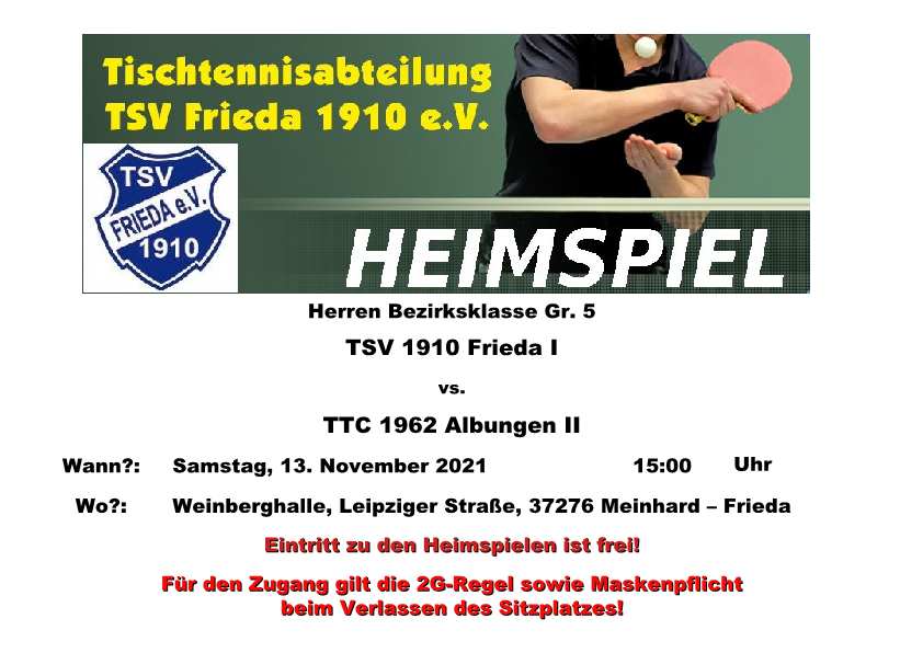 Kurzfristige Spielplanänderung! Heimspiel: TSV 1910 Frieda I – TTC 1962 Albungen II 11. November 2021 | Kategorie: Tischtennis, TSV Frieda