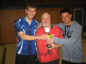 Es kristallisierte sich schnell heraus, dass der Turniersieg nur über die Doppelpaarungen Holzapfel/W.Jung und Marquardt/Hering gebucht werden konnte. Beide Duette gewannen die ersten Begegnungen, wobei Marquardt/Hering größte Mühe mit dem Doppel Fischer/Schott hatten. Bereits im ersten Satz mussten sie an ihre Grenzen gehen und einen 6:9 Rückstand aufholen. Sie konnten sich anfangs nur schwer auf die Linkshänderschüsse von Fischer einstellen, der ihnen sein druckvolles Spiel aufzwängte. Nach Anlaufschwierigkeiten konnten sie aber diesen Satz gewinnen. Die restlichen Sätze verliefen sehr ausgeglichen, so dass am Ende ein hart umkämpfter 3:2 Sieg von Marquardt/Hering zu Buche stand.