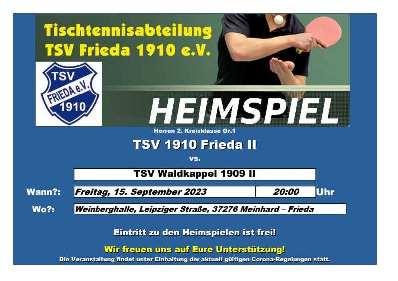 Spielankündigung: 1. Saison-Heimspiel TSV Frieda Herren II – TSV Waldkappel 1909 II
