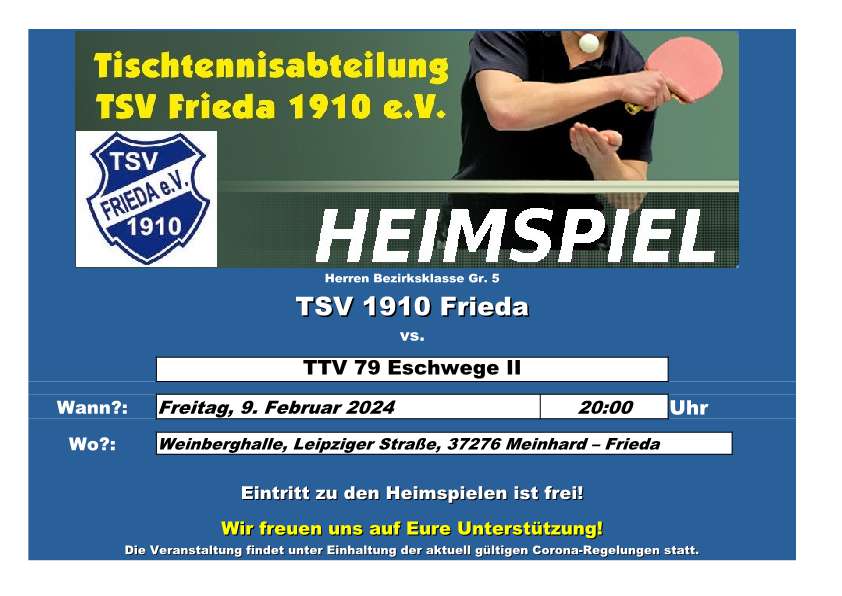 Spielankündigung: Heimspiel TSV Frieda Herren I – TTV 79 Eschwege II