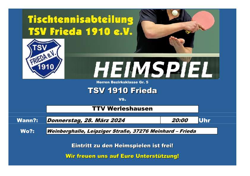 Spielankündigung: Heimspiel TSV Frieda Herren I – TTV Werleshausen 24. März 2024 | Kategorie: 1. Herren-Mannschaft, Tischtennis, TSV Frieda