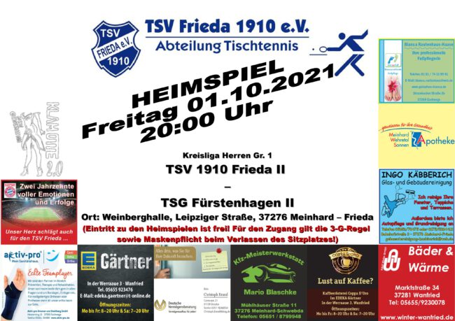 Spielankündigung: Heimspiel TSV Frieda II – TSG Fürstenhagen II 27. September 2021 | Kategorie: Tischtennis, TSV Frieda