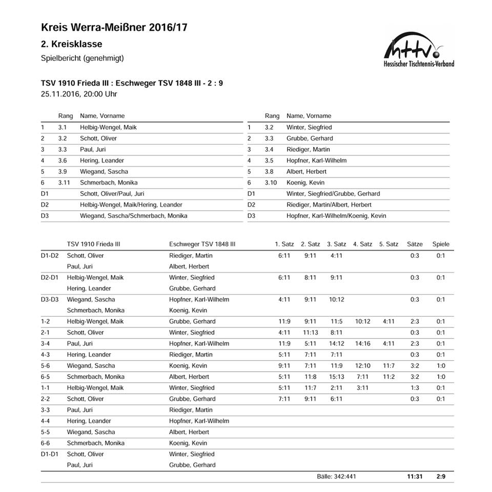 Nach den drei verlorenen Doppeln gab es für die Gastgeber im ersten und zweiten Paarkreuz nichts zu ernten. Ganz stark dagegen das dritte Friedsche Paarkeruz, in dem Sascha Wiegand und Moni Schmerbach groß aufspielten und (jeweils im fünften Satz) die beiden einzigen Punkte für Frieda holten. Vor allem Sascha Wiegand bewies Nervenstärke, denn im vierten Satz wehrte er fünf (!) Matchbälle des Gegners ab.