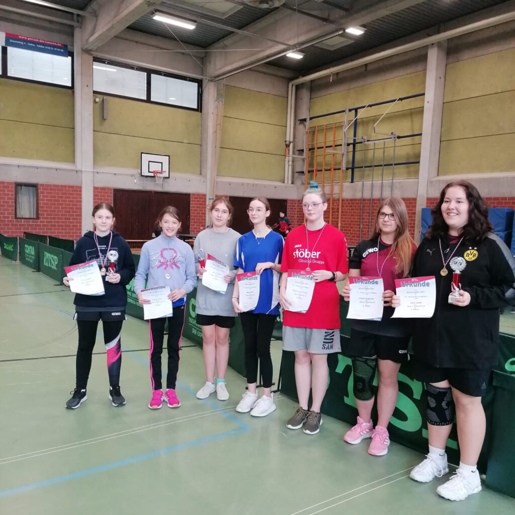 Platz 2 (AK 13): Lina Fischer (2. von links) Platz 1 (AK 13): Kyra Völzke (3. von links) Platz 4 (AK 19): Amelie Weber (mitte) |