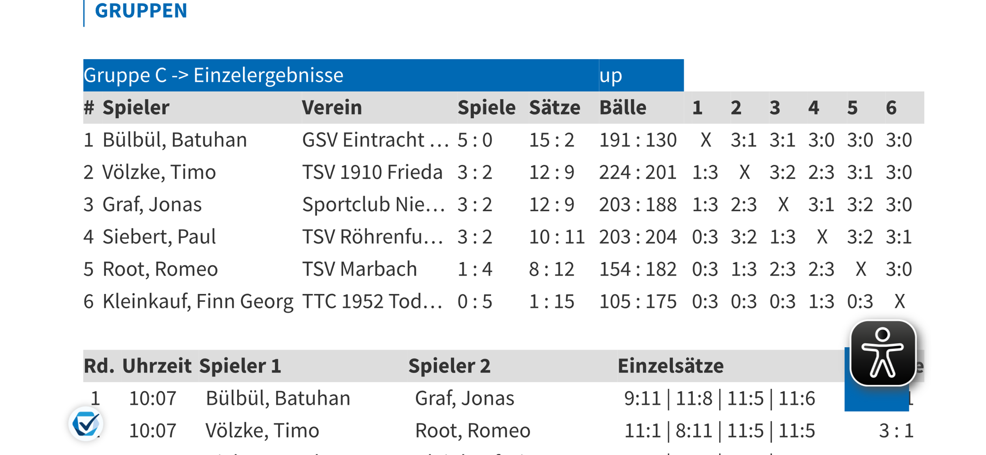 In der Gruppenphase erreichte Timo, bei einem Teilnehmerfeld von 18 Spielern, mit 3:2 Spielen einen hervorragenden 2. Platz in seiner Gruppe, was für den Einzug in die Endrunde der Top 6 reichte. Ausschlaggebend war hier der direkte Vergleich gegen seinen Kontrahenten Jonas Graf, den Timo 3:2 für sich entscheiden konnte.