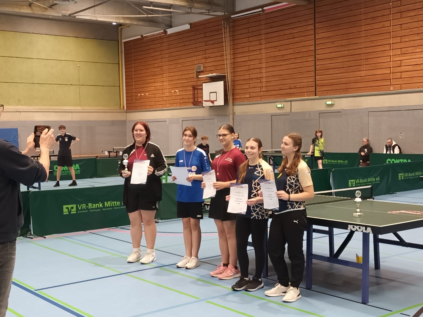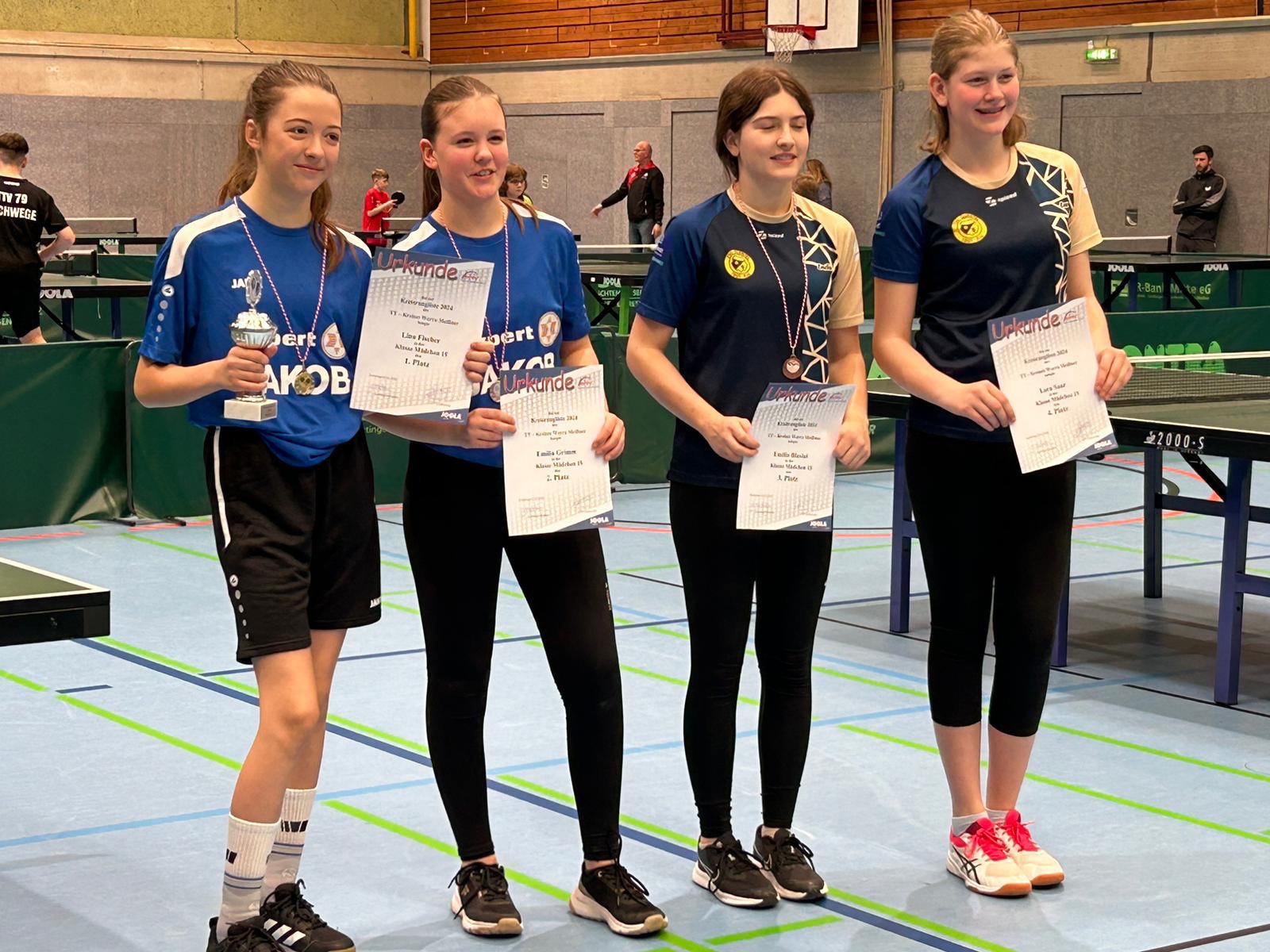 Bei den Mädchen 15 setzten sich Lina Fischer und Emilia Grimm als Gruppenerste bzw. Gruppenzweite durch und erreichten die Endrunde. Nur Lilly Störbrauck, die mit Emilia in die gleiche Gruppe gelost wurde, schaffte es mit einer Bilanz von 2:2 als Gruppendritte nicht in die Endrunde. Hier unterlag Emilia Grimm nur in einem Spiel, das gegen ihre Mannschaftskameradin Lina, die alle ihre Spiele gewann.