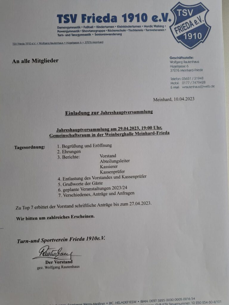 Noch einmal eine kurze Erinnerung an die Mitglieder der TSV Frieda zur anstehenden
